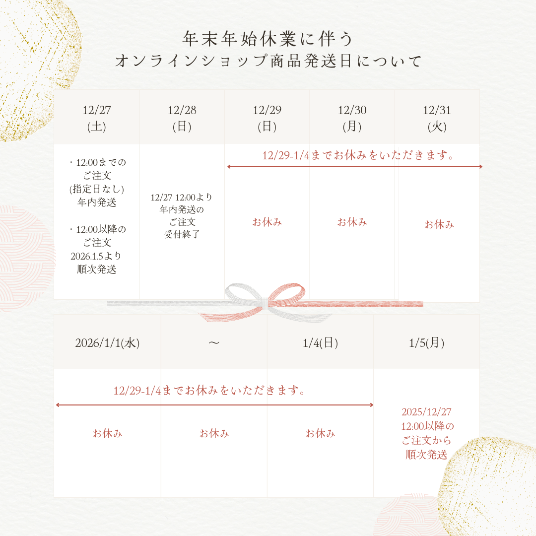 ※12/27(土)12:00以降のご注文は年明け1/5(月)から順次発送の手配をさせていただきます。